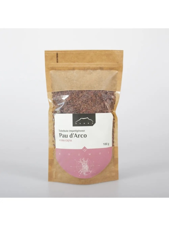 Pau d’Arco, La Pacho (Tabebuia impetiginosa) – piękne, okazałe drzewo o dłoniastych, ciemnozielonych liściach i jaskrawo-różowych kwiatach, osiągające do 30 metrów wysokości. Rośnie w lasach deszczowych od Meksyku aż po Argentynę. Jako surowiec zielarski wykorzystywana jest wewnętrzna warstwa jego kory. Główne substancje bioaktywne obecne w pau d’arco to: lapachol i beta-lapachon oraz kinony i naftokinony. Rdzenni Indianie nazywali je boskim drzewem, gdyż preparaty sporządzane z jego kory stanowiły dla nich główny środek medyczny, który stosowali w przypadku wielu dolegliwości. Współczesne badania potwierdzają, żeTabebuia impetiginosawspiera naturalną odporność organizmu oraz wykazuje korzystny wpływ na pracę wątroby.